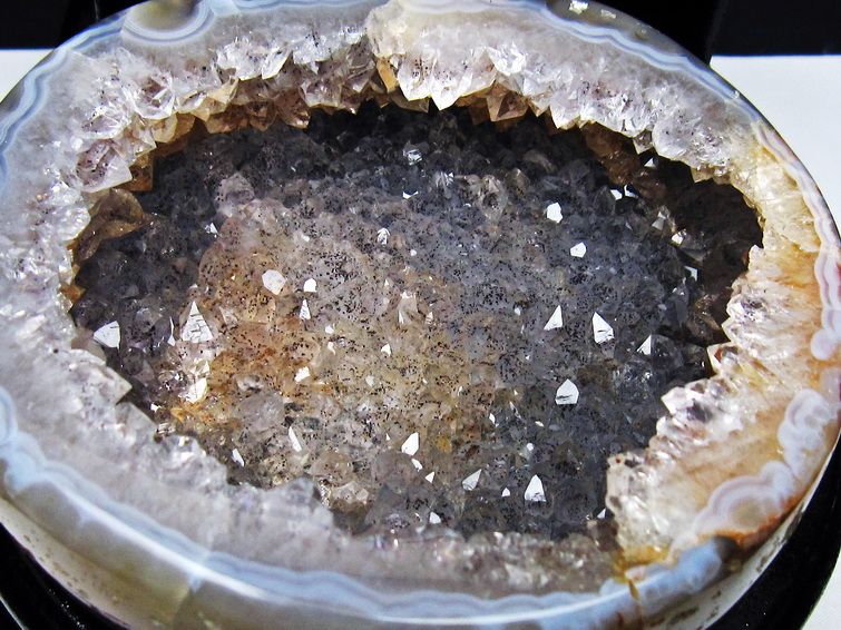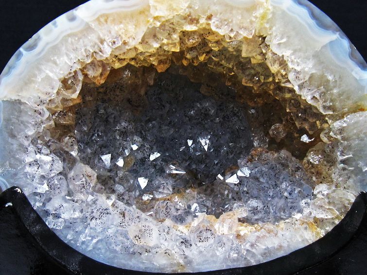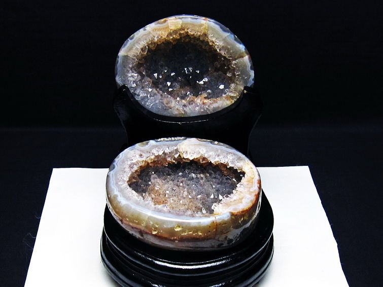 アゲート(瑪瑙)の原石を二つに切ったもので、中には空洞があり、周囲にびっしりと水晶の結晶が並んでいるパワーストーンです。このぽっかりと開いたくぼみ(龍穴)に気が集まるスポットが作り出され、運気上昇に繋がるとされます。龍穴(りゅうけつ)とは、風水における繁栄する土地の事で、龍穴がある場所は天変地異とも無縁であるとされます。