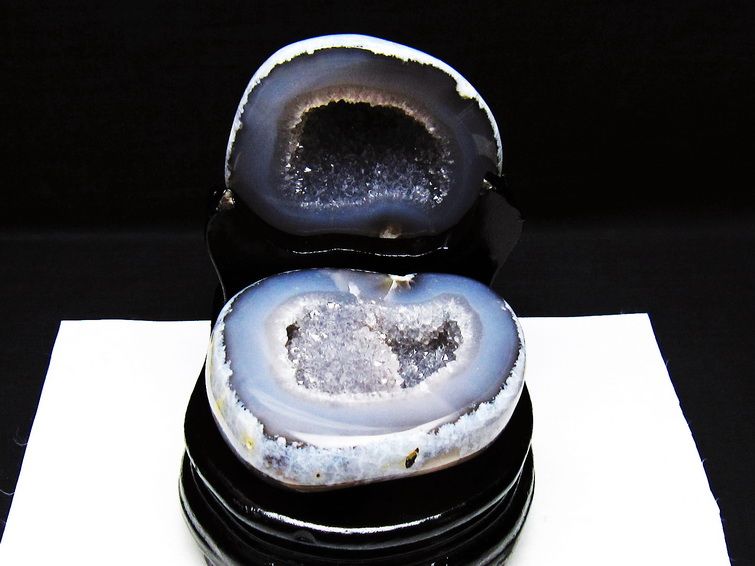 アゲート(瑪瑙)の原石を二つに切ったもので、中には空洞があり、周囲にびっしりと水晶の結晶が並んでいるパワーストーンです。このぽっかりと開いたくぼみ(龍穴)に気が集まるスポットが作り出され、運気上昇に繋がるとされます。龍穴(りゅうけつ)とは、風水における繁栄する土地の事で、龍穴がある場所は天変地異とも無縁であるとされます。