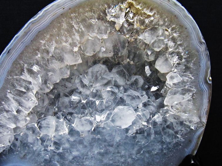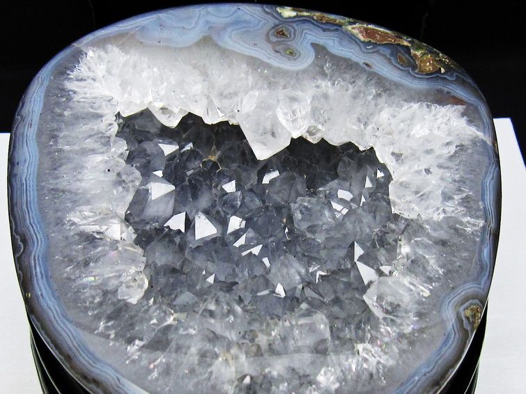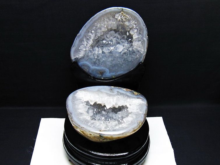 アゲート(瑪瑙)の原石を二つに切ったもので、中には空洞があり、周囲にびっしりと水晶の結晶が並んでいるパワーストーンです。このぽっかりと開いたくぼみ(龍穴)に気が集まるスポットが作り出され、運気上昇に繋がるとされます。龍穴(りゅうけつ)とは、風水における繁栄する土地の事で、龍穴がある場所は天変地異とも無縁であるとされます。