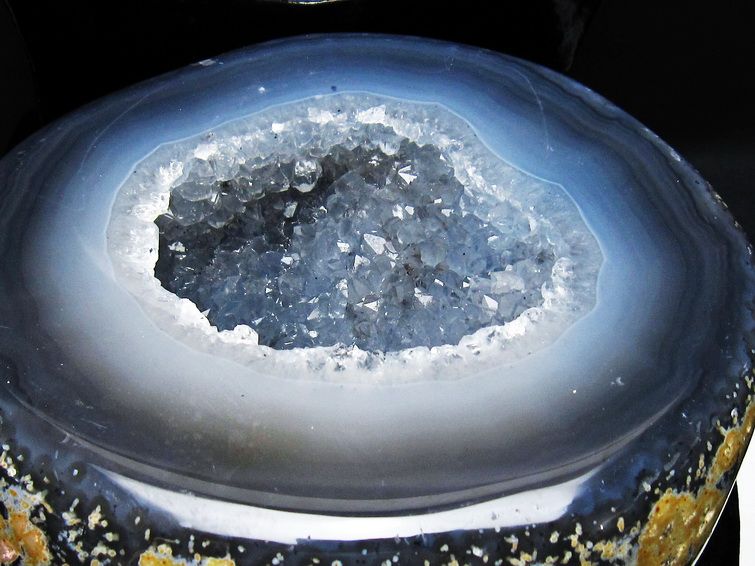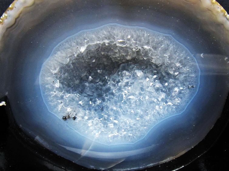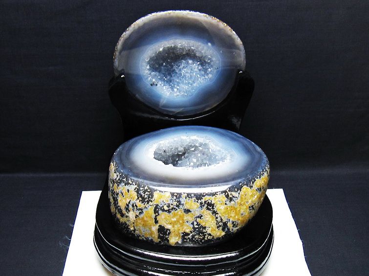 アゲート(瑪瑙)の原石を二つに切ったもので、中には空洞があり、周囲にびっしりと水晶の結晶が並んでいるパワーストーンです。このぽっかりと開いたくぼみ(龍穴)に気が集まるスポットが作り出され、運気上昇に繋がるとされます。龍穴(りゅうけつ)とは、風水における繁栄する土地の事で、龍穴がある場所は天変地異とも無縁であるとされます。