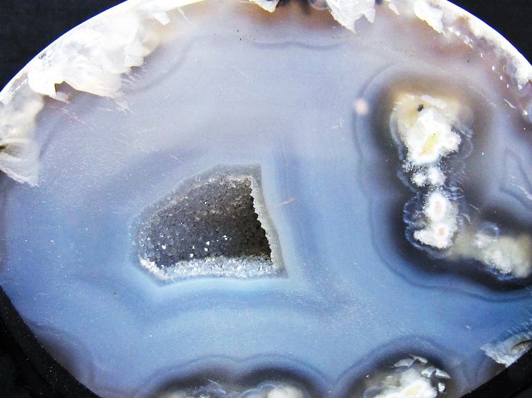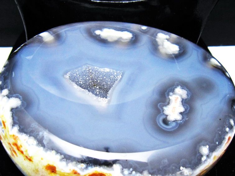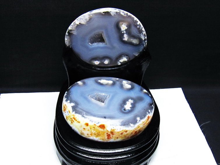 アゲート(瑪瑙)の原石を二つに切ったもので、中には空洞があり、周囲にびっしりと水晶の結晶が並んでいるパワーストーンです。このぽっかりと開いたくぼみ(龍穴)に気が集まるスポットが作り出され、運気上昇に繋がるとされます。龍穴(りゅうけつ)とは、風水における繁栄する土地の事で、龍穴がある場所は天変地異とも無縁であるとされます。