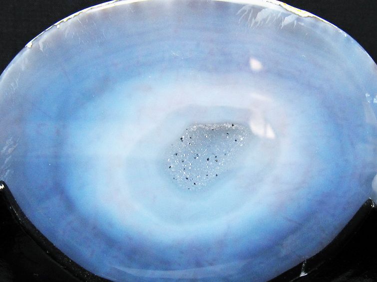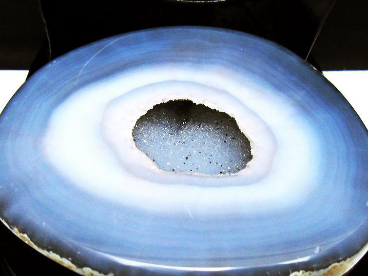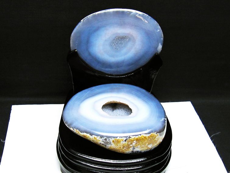 アゲート(瑪瑙)の原石を二つに切ったもので、中には空洞があり、周囲にびっしりと水晶の結晶が並んでいるパワーストーンです。このぽっかりと開いたくぼみ(龍穴)に気が集まるスポットが作り出され、運気上昇に繋がるとされます。龍穴(りゅうけつ)とは、風水における繁栄する土地の事で、龍穴がある場所は天変地異とも無縁であるとされます。