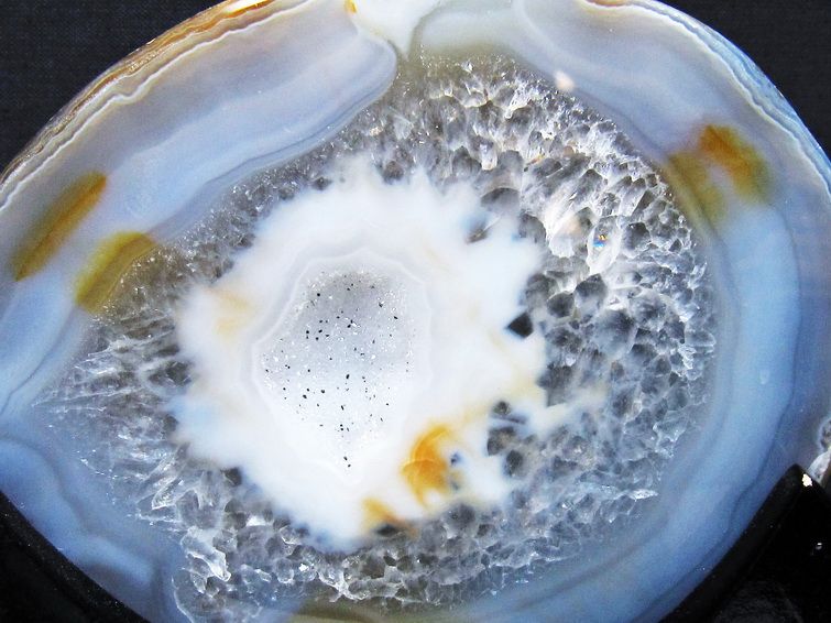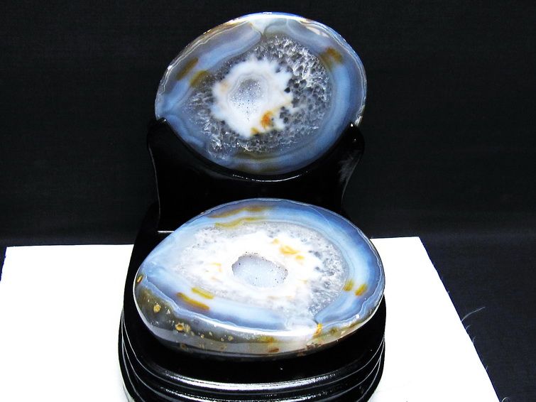 アゲート(瑪瑙)の原石を二つに切ったもので、中には空洞があり、周囲にびっしりと水晶の結晶が並んでいるパワーストーンです。このぽっかりと開いたくぼみ(龍穴)に気が集まるスポットが作り出され、運気上昇に繋がるとされます。龍穴(りゅうけつ)とは、風水における繁栄する土地の事で、龍穴がある場所は天変地異とも無縁であるとされます。