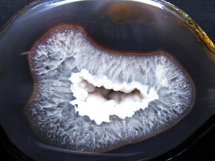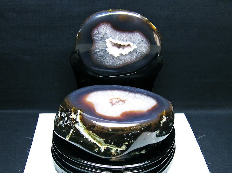 アゲート(瑪瑙)の原石を二つに切ったもので、中には空洞があり、周囲にびっしりと水晶の結晶が並んでいるパワーストーンです。このぽっかりと開いたくぼみ(龍穴)に気が集まるスポットが作り出され、運気上昇に繋がるとされます。龍穴(りゅうけつ)とは、風水における繁栄する土地の事で、龍穴がある場所は天変地異とも無縁であるとされます。