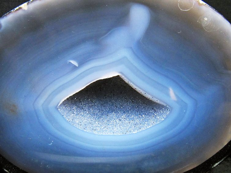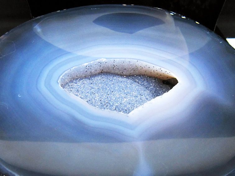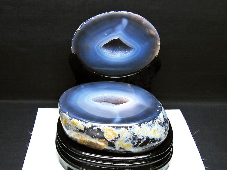 アゲート(瑪瑙)の原石を二つに切ったもので、中には空洞があり、周囲にびっしりと水晶の結晶が並んでいるパワーストーンです。このぽっかりと開いたくぼみ(龍穴)に気が集まるスポットが作り出され、運気上昇に繋がるとされます。龍穴(りゅうけつ)とは、風水における繁栄する土地の事で、龍穴がある場所は天変地異とも無縁であるとされます。
