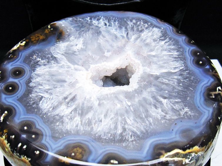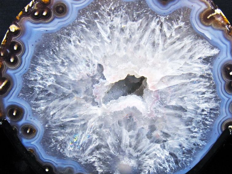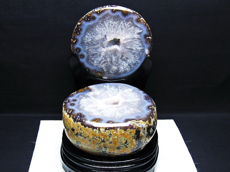 アゲート(瑪瑙)の原石を二つに切ったもので、中には空洞があり、周囲にびっしりと水晶の結晶が並んでいるパワーストーンです。このぽっかりと開いたくぼみ(龍穴)に気が集まるスポットが作り出され、運気上昇に繋がるとされます。龍穴(りゅうけつ)とは、風水における繁栄する土地の事で、龍穴がある場所は天変地異とも無縁であるとされます。