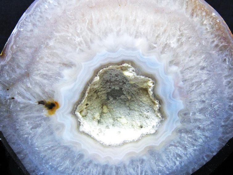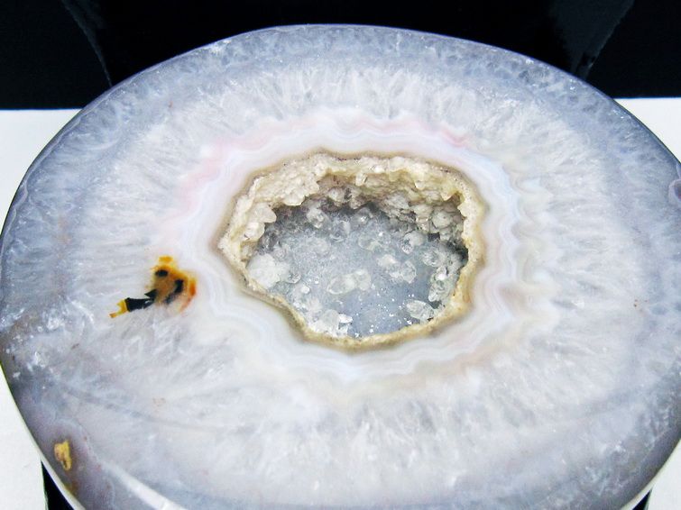 アゲート(瑪瑙)の原石を二つに切ったもので、中には空洞があり、周囲にびっしりと水晶の結晶が並んでいるパワーストーンです。このぽっかりと開いたくぼみ(龍穴)に気が集まるスポットが作り出され、運気上昇に繋がるとされます。龍穴(りゅうけつ)とは、風水における繁栄する土地の事で、龍穴がある場所は天変地異とも無縁であるとされます。