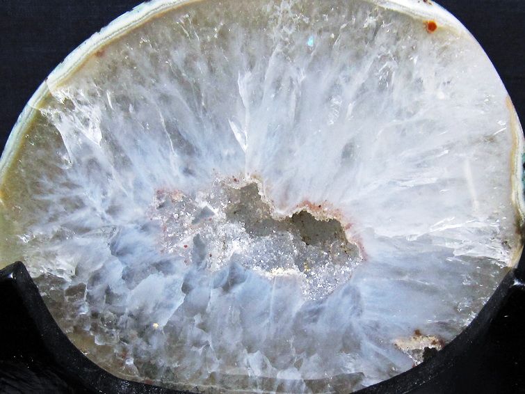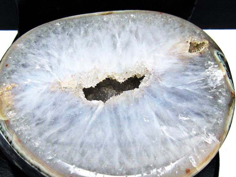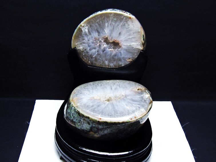 アゲート(瑪瑙)の原石を二つに切ったもので、中には空洞があり、周囲にびっしりと水晶の結晶が並んでいるパワーストーンです。このぽっかりと開いたくぼみ(龍穴)に気が集まるスポットが作り出され、運気上昇に繋がるとされます。龍穴(りゅうけつ)とは、風水における繁栄する土地の事で、龍穴がある場所は天変地異とも無縁であるとされます。