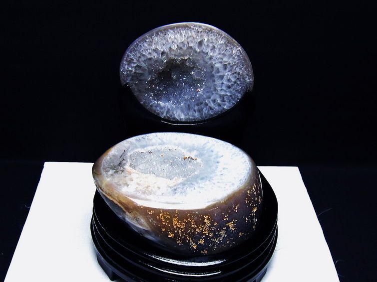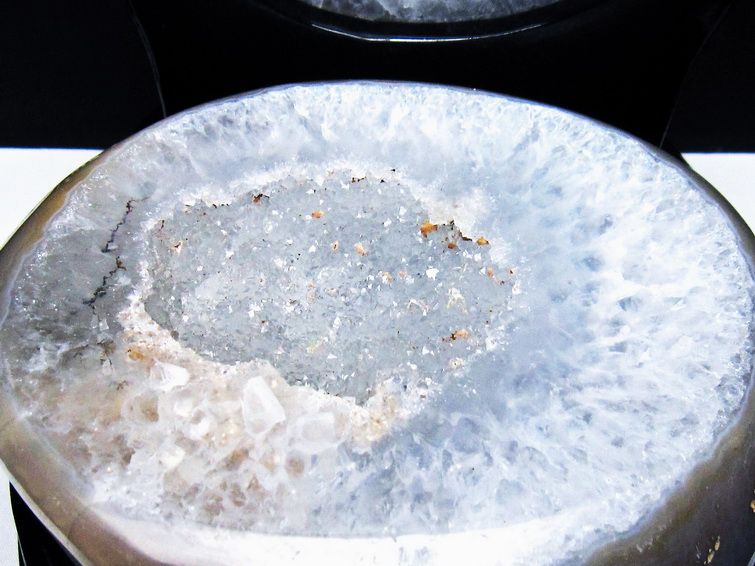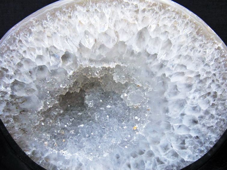 アゲート(瑪瑙)の原石を二つに切ったもので、中には空洞があり、周囲にびっしりと水晶の結晶が並んでいるパワーストーンです。このぽっかりと開いたくぼみ(龍穴)に気が集まるスポットが作り出され、運気上昇に繋がるとされます。龍穴(りゅうけつ)とは、風水における繁栄する土地の事で、龍穴がある場所は天変地異とも無縁であるとされます。