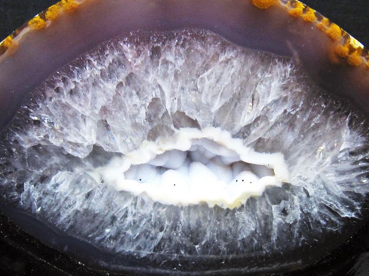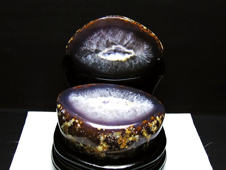 アゲート(瑪瑙)の原石を二つに切ったもので、中には空洞があり、周囲にびっしりと水晶の結晶が並んでいるパワーストーンです。このぽっかりと開いたくぼみ(龍穴)に気が集まるスポットが作り出され、運気上昇に繋がるとされます。龍穴(りゅうけつ)とは、風水における繁栄する土地の事で、龍穴がある場所は天変地異とも無縁であるとされます。