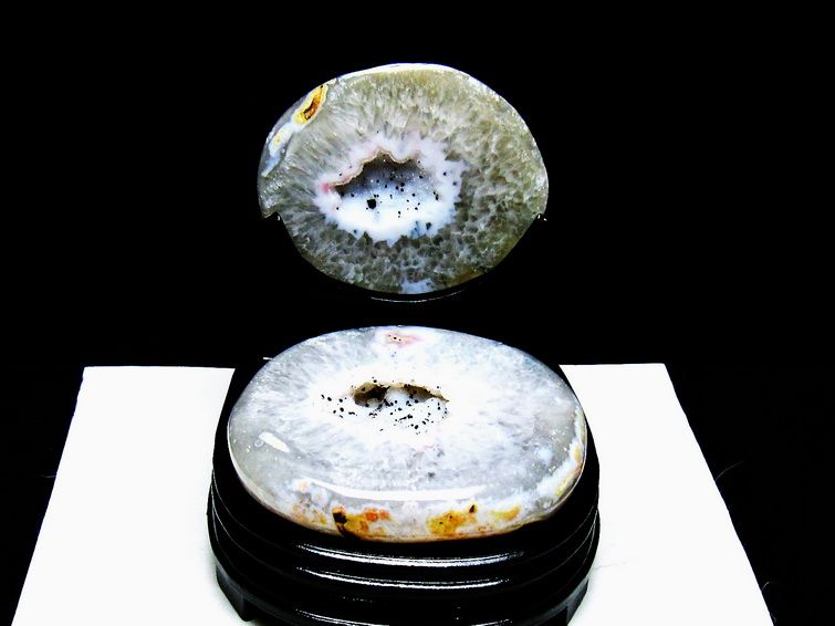 アゲート(瑪瑙)の原石を二つに切ったもので、中には空洞があり、周囲にびっしりと水晶の結晶が並んでいるパワーストーンです。このぽっかりと開いたくぼみ(龍穴)に気が集まるスポットが作り出され、運気上昇に繋がるとされます。龍穴(りゅうけつ)とは、風水における繁栄する土地の事で、龍穴がある場所は天変地異とも無縁であるとされます。