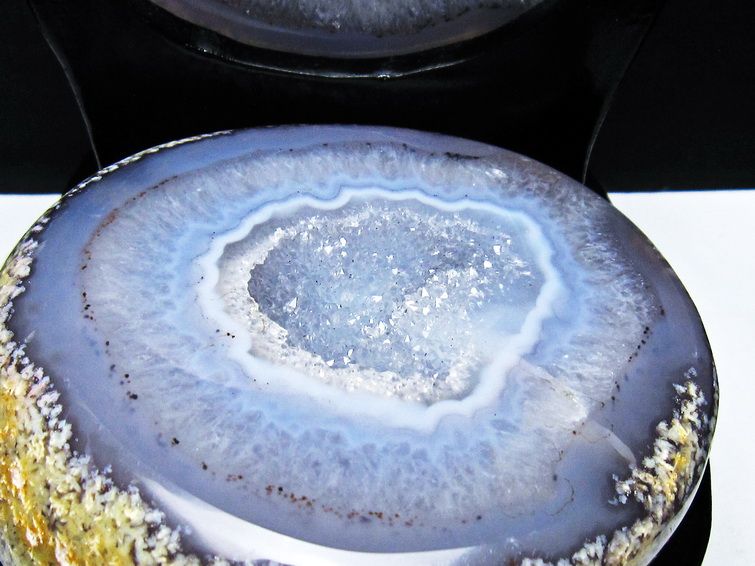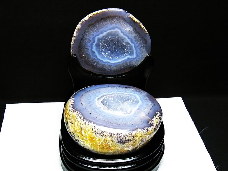 アゲート(瑪瑙)の原石を二つに切ったもので、中には空洞があり、周囲にびっしりと水晶の結晶が並んでいるパワーストーンです。このぽっかりと開いたくぼみ(龍穴)に気が集まるスポットが作り出され、運気上昇に繋がるとされます。龍穴(りゅうけつ)とは、風水における繁栄する土地の事で、龍穴がある場所は天変地異とも無縁であるとされます。