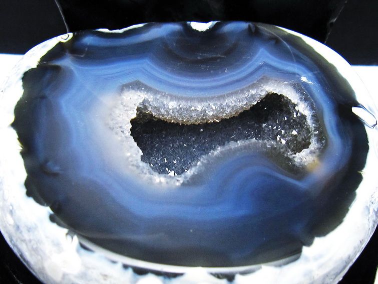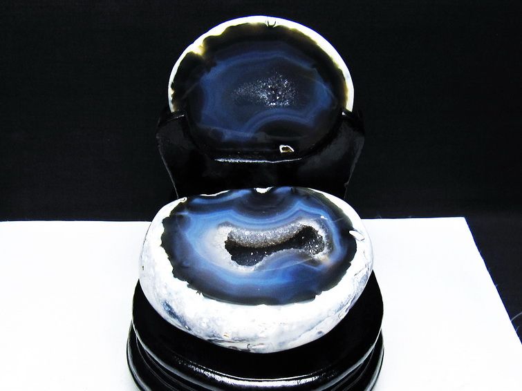 アゲート(瑪瑙)の原石を二つに切ったもので、中には空洞があり、周囲にびっしりと水晶の結晶が並んでいるパワーストーンです。このぽっかりと開いたくぼみ(龍穴)に気が集まるスポットが作り出され、運気上昇に繋がるとされます。龍穴(りゅうけつ)とは、風水における繁栄する土地の事で、龍穴がある場所は天変地異とも無縁であるとされます。