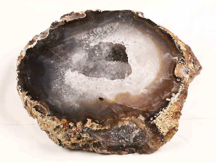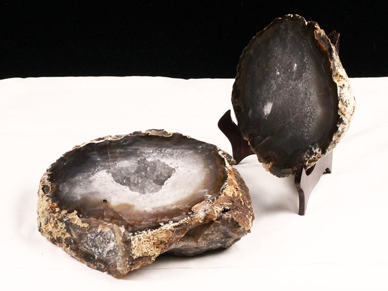 アゲート(瑪瑙)の原石を二つに切ったもので、中には空洞があり、周囲にびっしりと水晶の結晶が並んでいるパワーストーンです。このぽっかりと開いたくぼみ(龍穴)に気が集まるスポットが作り出され、運気上昇に繋がるとされます。龍穴(りゅうけつ)とは、風水における繁栄する土地の事で、龍穴がある場所は天変地異とも無縁であるとされます。