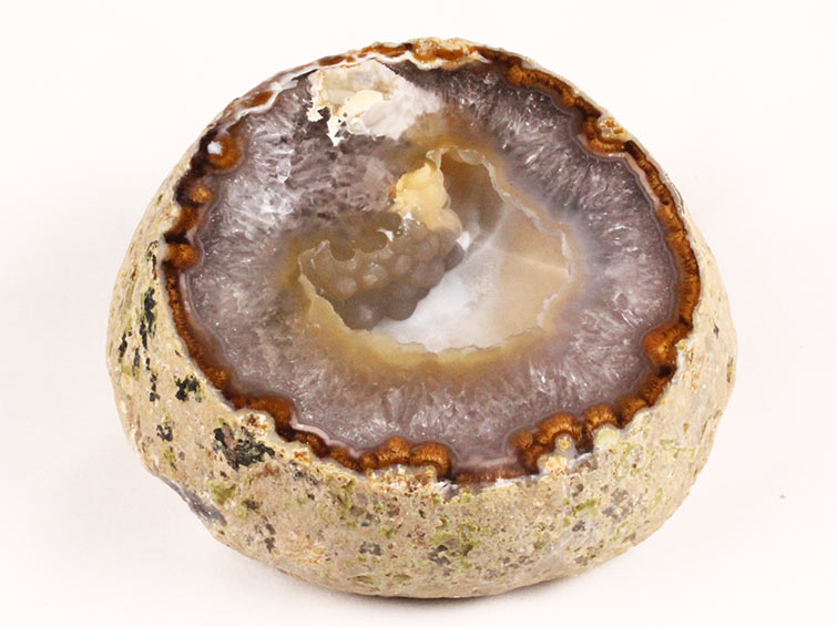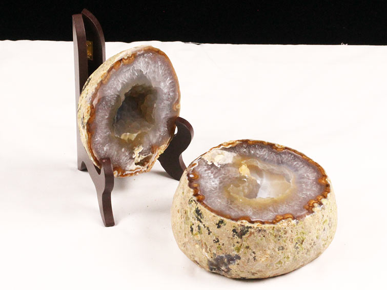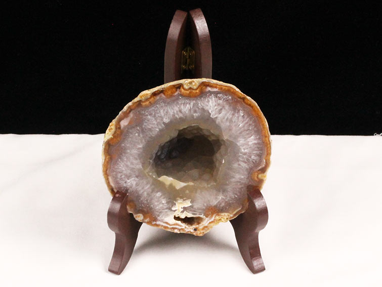 アゲート(瑪瑙)の原石を二つに切ったもので、中には空洞があり、周囲にびっしりと水晶の結晶が並んでいるパワーストーンです。このぽっかりと開いたくぼみ(龍穴)に気が集まるスポットが作り出され、運気上昇に繋がるとされます。龍穴(りゅうけつ)とは、風水における繁栄する土地の事で、龍穴がある場所は天変地異とも無縁であるとされます。